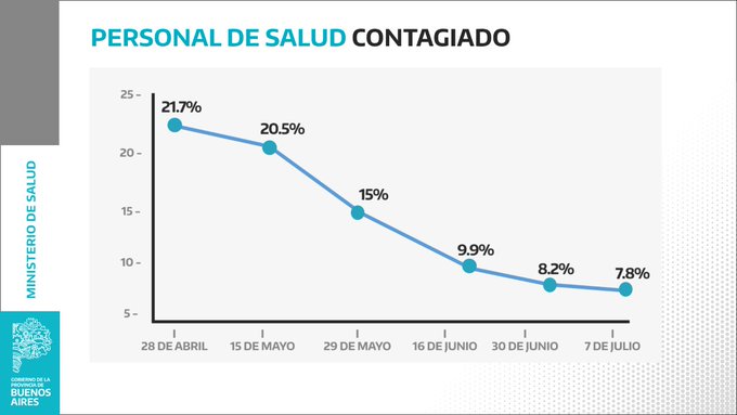 El 15 de mayo era de 20,5%; y 14 días después cayó al 15%; el 16 de junio era del 9,9%; el 30 fue de 8,2% y el último reporte del 7 de julio indica que solo el 7,8% de los casos de coronavirus corresponde a personal sanitario, se informó en un comunicado.