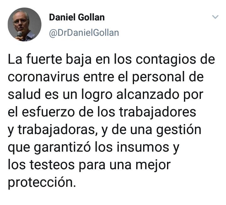 En ese sentido, Gollan posteó hoy en redes sociales que “la fuerte baja en los contagios de coronavirus entre el personal de salud es un logro alcanzado por el esfuerzo de los trabajadores y trabajadoras, y de una gestión que garantizó los insumos y los testeos para una mejor protección”.