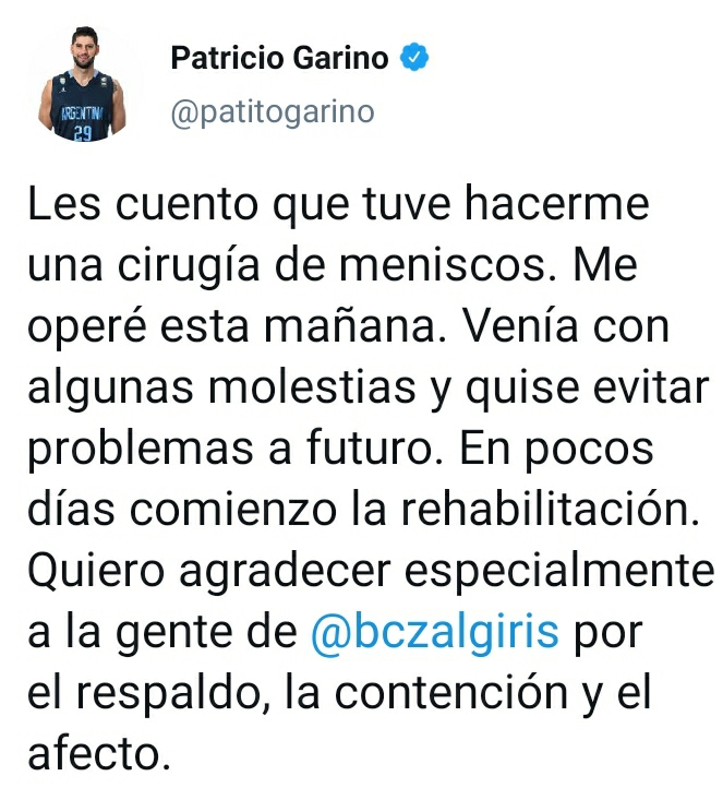 Esto fue informado por el mismo basquetbolista marplatense en sus redes sociales con el siguiente mensaje: “Les cuento que tuve hacerme una cirugía de meniscos. Me operé esta mañana. Venía con algunas molestias y quise evitar problemas a futuro. En pocos días comienzo la rehabilitación. Quiero agradecer especialmente a la gente de @bczalgiris por el respaldo, la contención y el afecto“.
