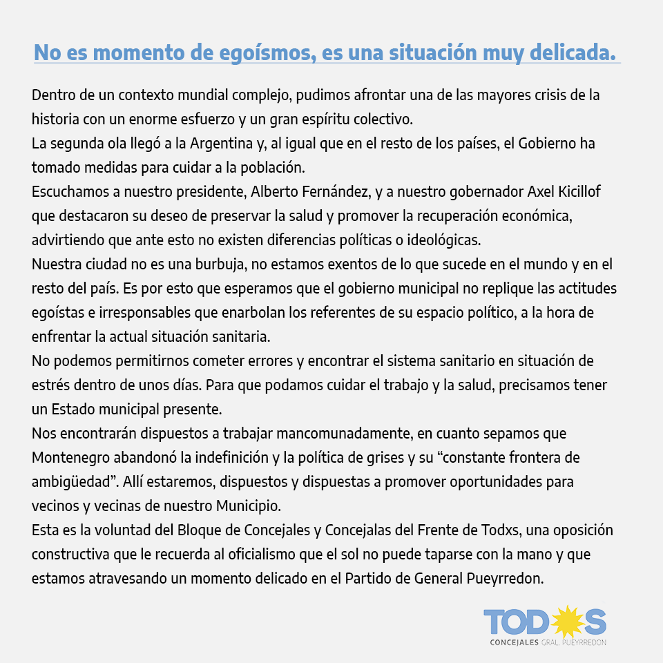 Además, sostuvieron que “nuestra ciudad no es una burbuja, no estamos exentos de lo que sucede en el mundo y en el resto del país. Es por esto que esperamos que el gobierno municipal no replique las actitudes egoístas e irresponsables que enarbolan los referentes de su espacio político, a la hora de enfrentar la actual situación sanitaria”.