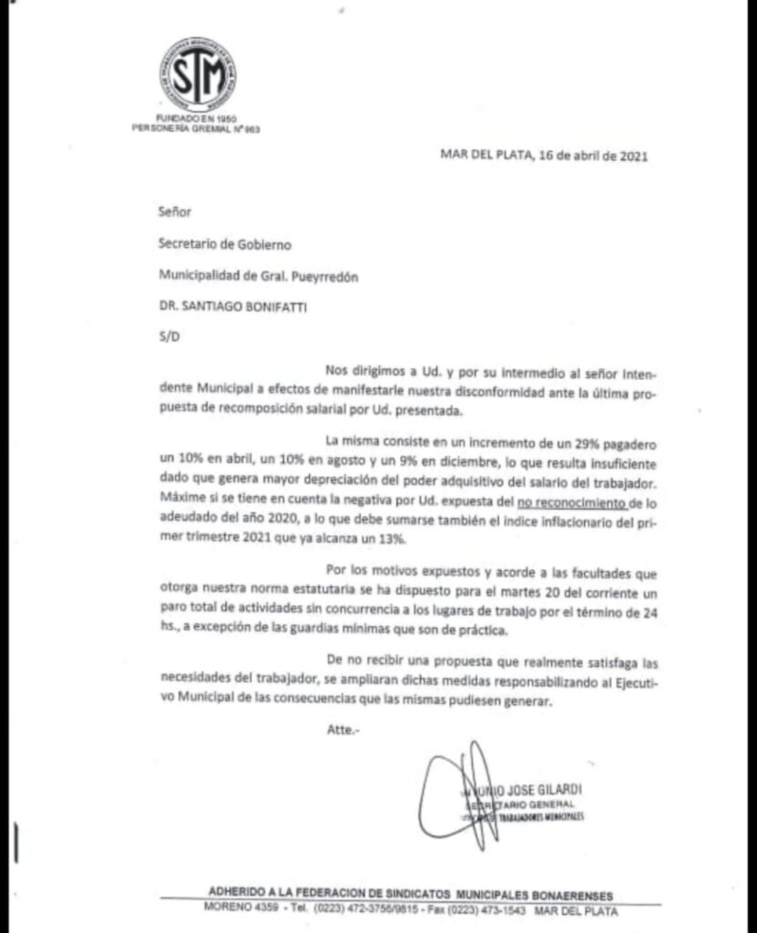 “Por los motivos expuestos y acorde a las facultades que otorga nuestra norma estatuaria se ha dispuesto para el martes 20 del corriente un paro total de actividades sin concurrencia a los lugares de trabajo por el término de 24 horas, a excepción de las guardias mínimas que son de práctica”, informa la comunicación a Bonifatti.