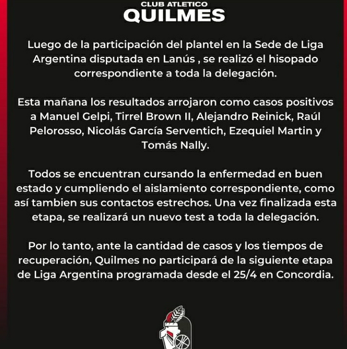 Cabe destacar que “Todos se encuentran cursando la enfermedad en buen estado y cumpliendo el aislamiento correspondiente, como así también sus contactos estrechos”, según reza el comunicado oficial que envió esta tarde el Club Atlético Quilmes a través de sus redes sociales.