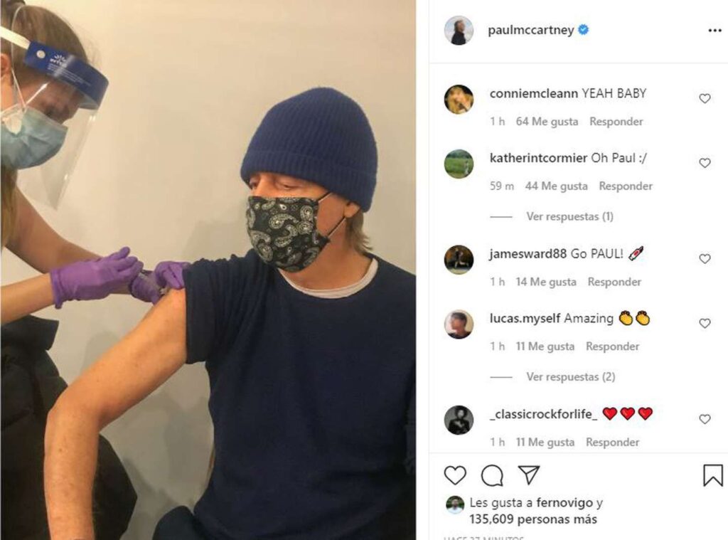 Paul McCartney compartió en sus redes sociales una foto que deja el registro del feliz momento en que recibió la vacuna contra el coronavirus. El músico de 79 años escribió un mensaje para fomentar la campaña en todo el mundo.