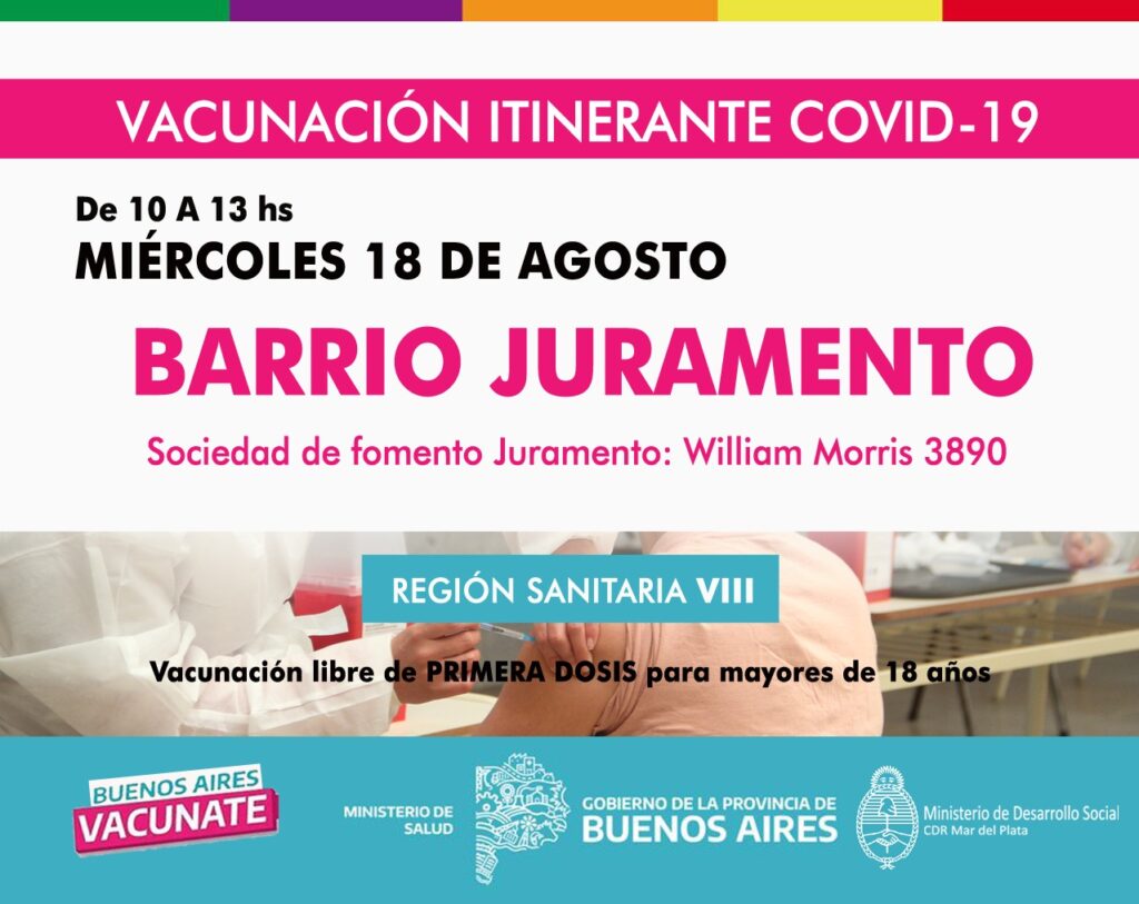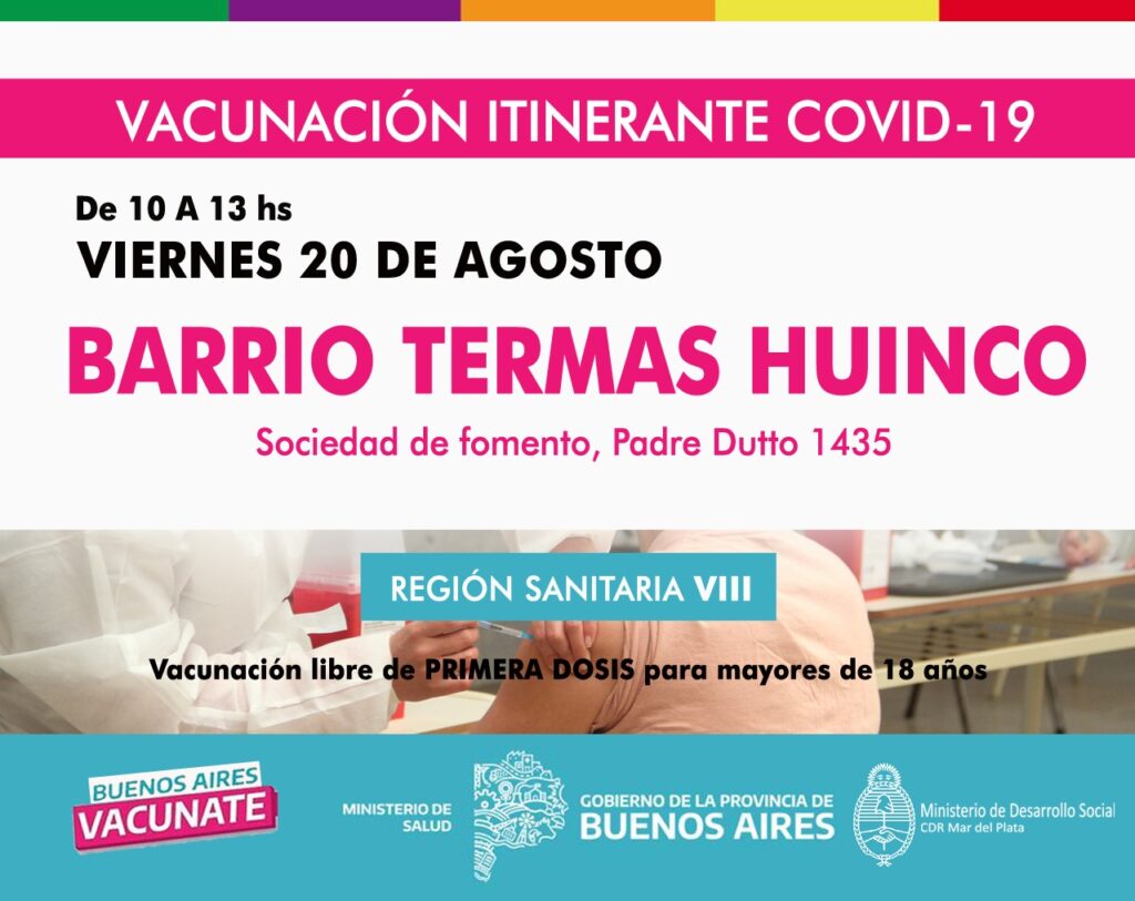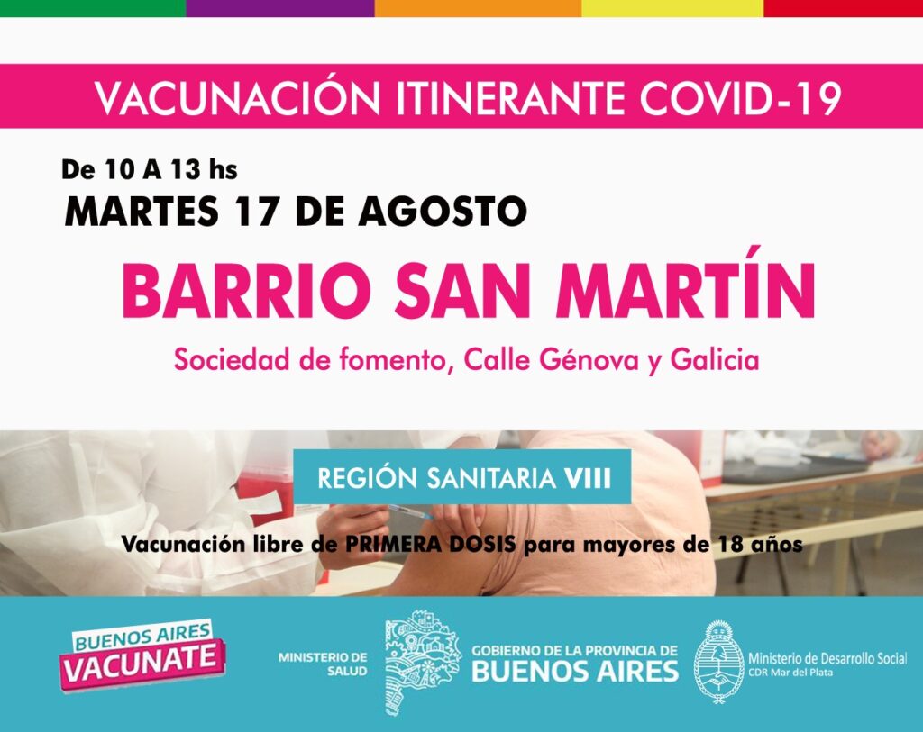 Desde Región Sanitaria VIII informaron que desde el 17 al 21 de agosto las postas sanitarias itinerantes continuarán la vacunación libre de primeras dosis para mayores de 18 años en diferentes barrios de Mar del Plata para seguir con la campaña del gobierno bonaerense.
