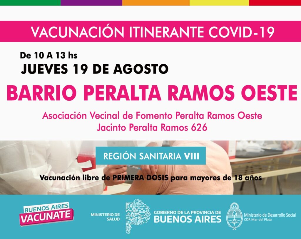 Por su parte, el 19 también en el horario de 10 a 13 se vacunará de manera libre a mayores de 18 en la asociación vecinal de fomento del barrio Peralta Ramos Oeste (Jacinto Peralta Ramos 626).