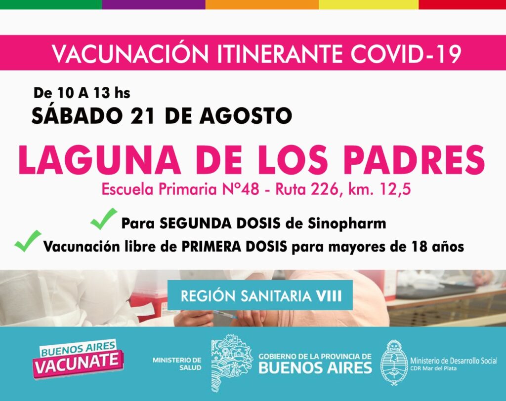 Por último, para finalizar la semana, el sábado 21 de 10 a 13, se podrán inocular en primera dosis mayores de 18 años y segunda dosis de Sinopharm a vecinos de Laguna de los Padres (escuela primaria n° 48. ruta 226- km 12.5).