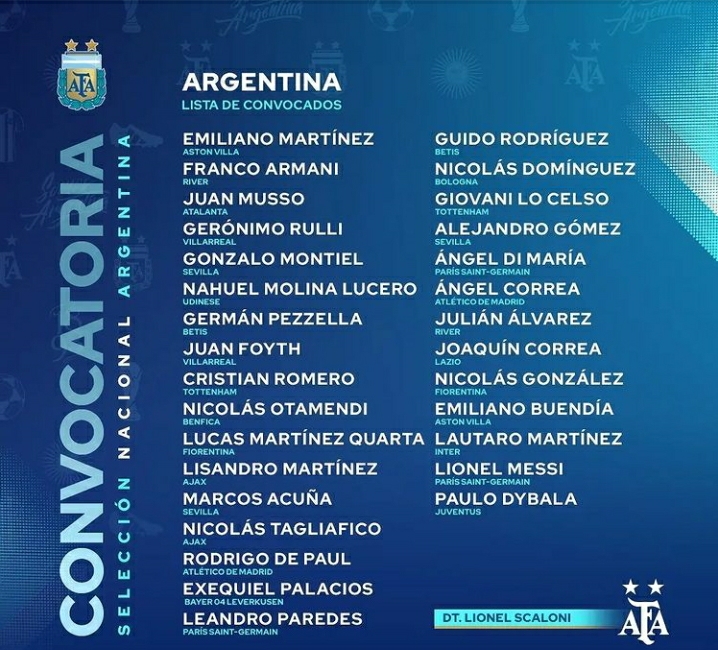 • Delanteros: Lionel Messi, Lautaro Martínez, Nicolás González, Ángel Correa, Paulo Dybala, Emiliano Buendía, Ángel Di María, Julián Álvarez y Joaquín Correa.