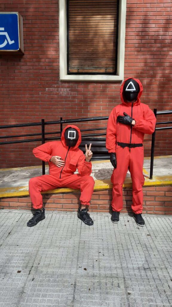 También en CABA, dos guardias de El juego del calamar llegaron a un colegio de San Cristobal donde votó el candidato a Diputado Nacional del Frente de Todos, Lenadro Santoro.
