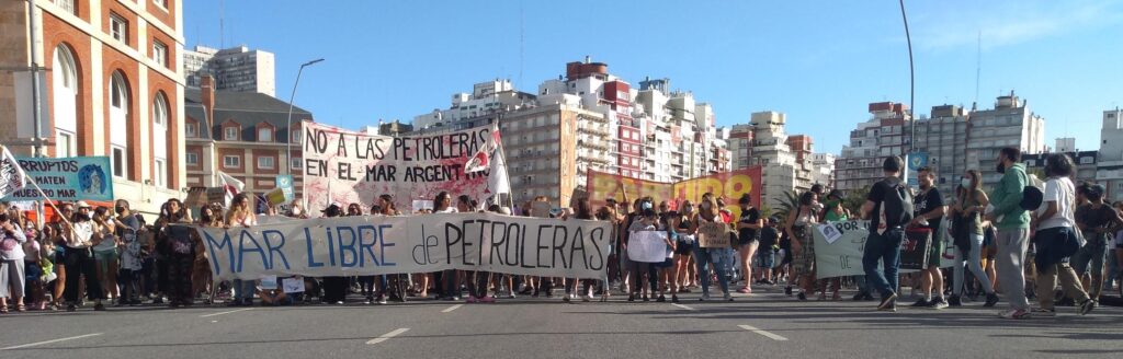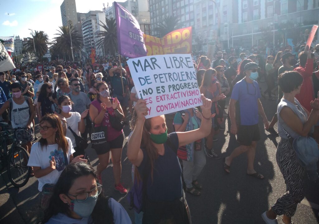 “¡Mar libre de petroleras!” fue una de las consignas elegidas por la multitud que se congregó esta tarde en La Rambla y marchó hacia la Plaza San Martín en rechazo de la llegada de empresas petroleras multinacionales a la costa bonaerense.