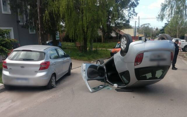 Un violento accidente se produjo esta tarde en Figueroa Alcorta entre Gutemberg y Calabria, cuando una mujer de 26 años terminó volcando su vehículo Ford Ka “tatto”, luego de chocar a otro automóvil de la misma marca que estaba estacionado en el lugar, según informaron efectivos policiales de la comisaría 5ta en su parte de prensa.