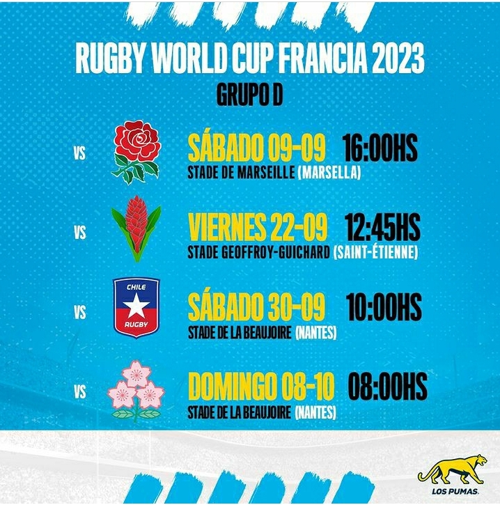 El próximo sábado 26 de agosto, los Pumas se enfrentará en su último test match antes de la Copa del Mundo a España. El debut en el Mundial será ante Inglaterra, el próximo 9 de septiembre en Marsella. A continuación, el resto de los encuentros por el Grupo D serán frente a Samoa (viernes 22 en Saint-Etienne), ante Chile (sábado 30 en Nantes) y el cierre será ante Japón en la misma ciudad el domingo 8 de octubre.