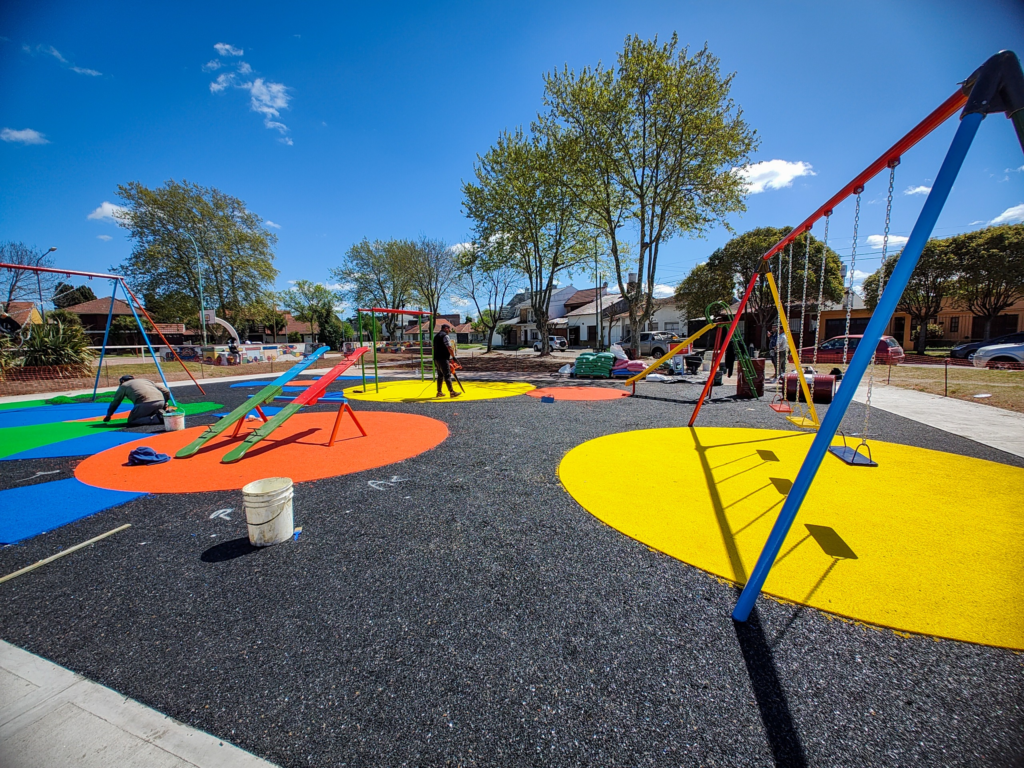 Se concretaron veredas de dos metros de ancho, laterales al área de juegos, se instalaron seis pérgolas de caño estructural y se instaló luminaria peatonal en los senderos. También se reparó la carpeta en los senderos interiores de piso de hormigón pintado en los sectores deteriorados. Por último, se llevó a cabo la nivelación y parquización de los sectores aledaños al área de juegos nueva.