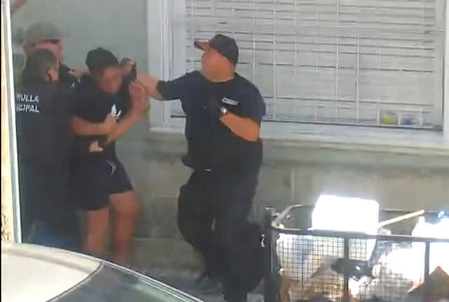En las imágenes se puede ver a los agentes municipales intentando sacar a una persona que dormía en la vía pública, quien reaccionó tirando un par de golpes a los uniformados. Tras esta situación, los agentes golpean y terminan reduciendo al hombre.