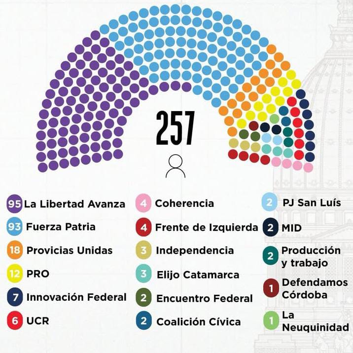 De esta manera, de las 257 bancas en la cámara baja: 95 pertenecen a La Libertad Avanza, 93 a Fuerza Patria, 18 a Provincias Unidas, 12 al PRO, 7 a Innovación Federal, 6 a la UCR, 4 a Coherencia, otros 4 al Frente de Izquierda, 3 a Independencia, 3 al nuevo bloque Elijo Catamarca, 2 a Encuentro Federal, 2 a la Colación Cívica, 2 al PJ San Luis, 2 al MID; 2 a Producción y Trabajo, 1 a Defendamos Córdoba y 1 a La Neuquinidad.
