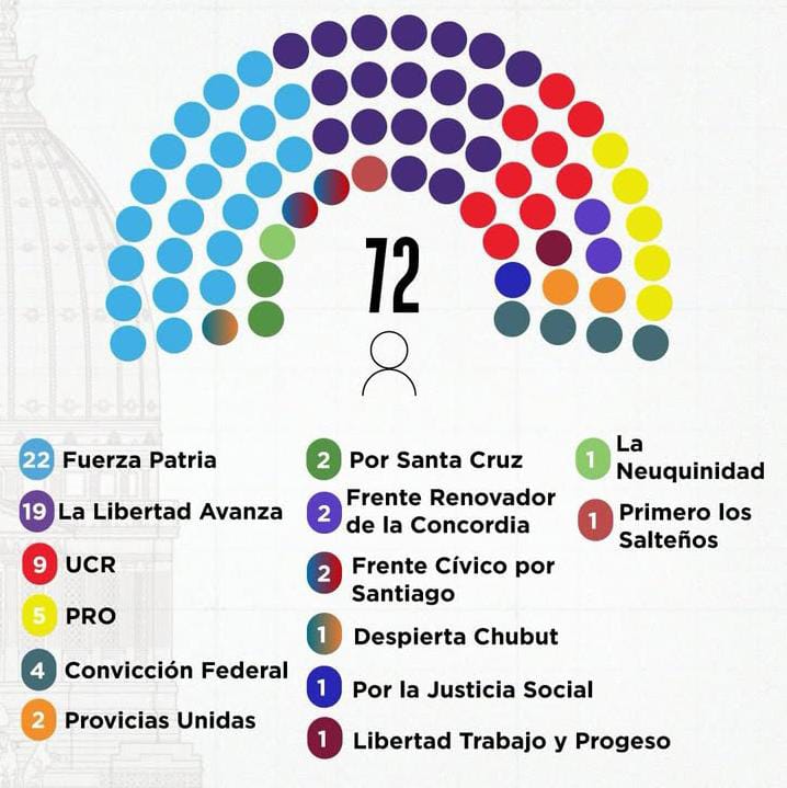 De esta manera de las 72 bancas del senado, Fuerza Patria dispone 22, La Libertad Avanza quedó con 19, la UCR con 9, el PRO 5, Convicción Federal tiene 4. Con dos bancas aparecen Provincias Unidas, Por Santa Cruz, Frente Renovador de la Concordia y el Frente Cívico por Santiago.