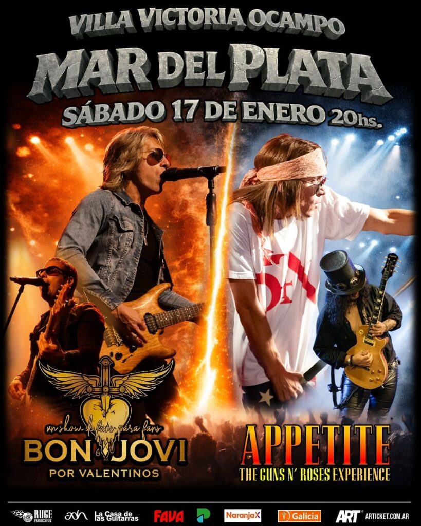 El rock que marcó a generaciones vuelve a latir con fuerza en Mar del Plata. El sábado 17 de enero a las 20, la histórica Villa Victoria (Matheu 1851) será escenario de una noche única donde los grandes himnos de los años ´80 y ´90 volverán a sonar de la mano de Valentinos (Bon Jovi) y Appetite “The Guns N’ Roses Experience”, dos propuestas que rinden homenaje a bandas legendarias y a una era inolvidable. Las entradas se pueden adquirir a través de Articket.