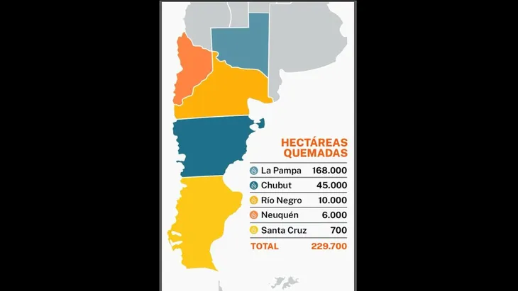 En los últimos meses, La Pampa registró más de 168.000 hectáreas quemadas, Chubut 45.000, Río Negro 10.000, Neuquén 6.000 y Santa Cruz 700. En total, hay más de 230.000 hectáreas de tierras y biomasa arrasadas, lo que representa un impacto ambiental y productivo con pocos antecedentes la región.