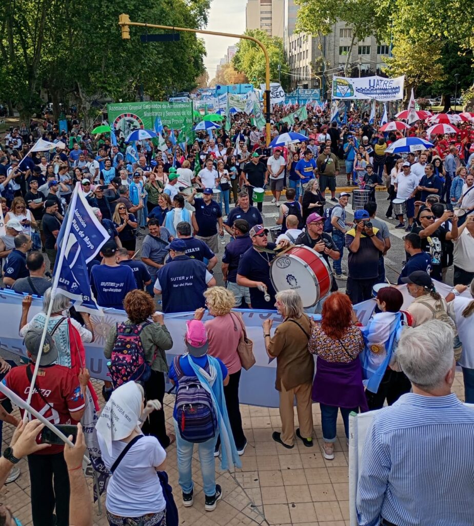 Desde las 16 comenzó la concentración en Avenida Luro y 14 de Julio (Plaza Rocha) y pasadas las 17 las columnas de los gremios que nuclean a gran parte de los trabajadores en relación de dependencia de la ciudad, se movilizaron hacia el Monumento a San Martín.