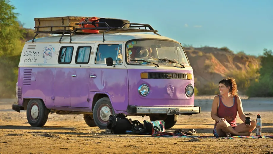 La combi por dentro es biblioteca y también casa. Fabricada en madera, pequeña y sencilla, está equipada con cama, garrafa y estanterías que parecieran multiplicarse. Durante el día, Laura conduce y hace paradas en escuelas rurales, centros culturales o plazas. Por las noches, duerme protegida por cientos de libros.