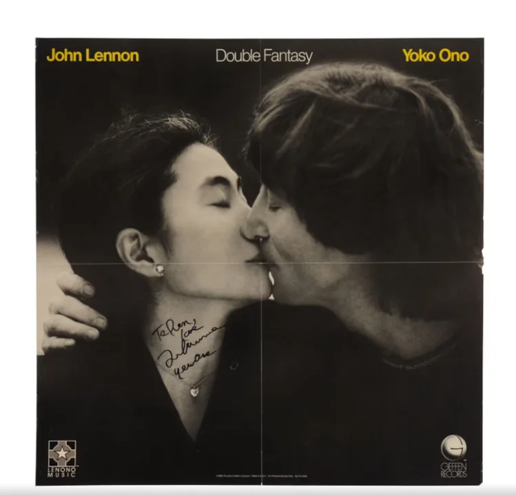 El catálogo suma además una de las piezas más esperadas: un póster promocional del álbum Double Fantasy, de Yoko Ono y John Lennon, firmado por este último el 8 de diciembre de 1980, pocas horas antes de su muerte. El objeto, dedicado al presentador Ron Hummel, podría alcanzar entre 60.000 y 120.000 libras.