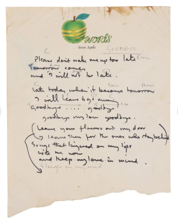 Otros artículos vinculados a The Beatles incluyen un borrador de la letra de Goodbye, escrita por Paul McCartney en 1969; un traje usado por Ringo Starr en 1964; y una partitura manuscrita de While My Guitar Gently Weeps, de George Harrison.