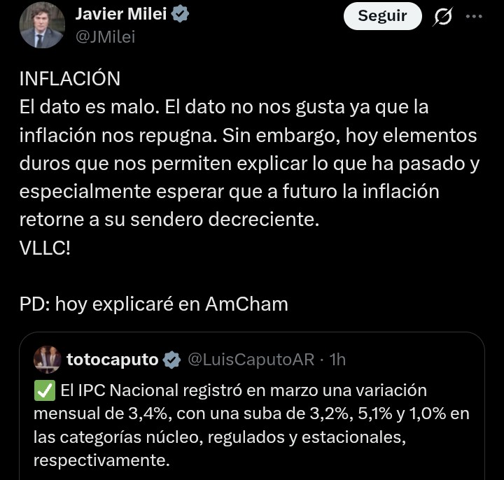 Tras conocerse el dato, el Presidente admitió en sus redes sociales que el Índice de Precios al Consumidor (IPC) de marzo “es malo”. Sin embargo también sostuvo que “hay elementos duros que nos permiten explicar lo que ha pasado y especialmente esperar que a futuro la inflación retorne a su sendero decreciente”.